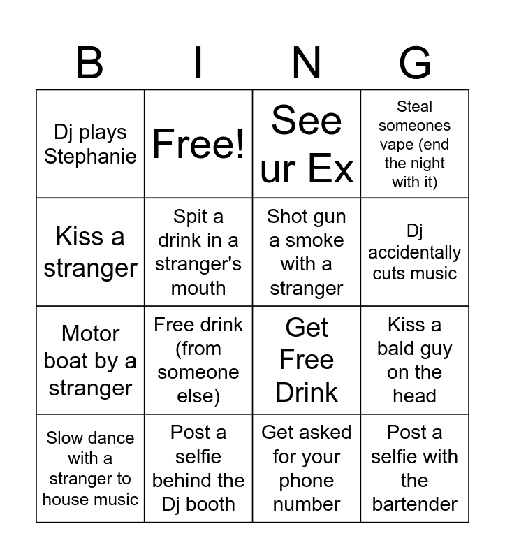 This bingo card has 19 words: Get Free Drink, Take a Shot, See ur Ex, Post a selfie with the bartender, Kiss a bald guy on the head, Kiss a stranger, Get asked for your phone number, Dj plays Stephanie, Free!, Motor boat by a stranger, Free drink (from someone else), Spit a drink in a stranger's mouth, Shot gun a smoke with a stranger, Post a selfie behind the Dj booth, Slow dance with a stranger to house music, Get Free Drink, Steal someones vape (end the night with it), Dj accidentally cuts music and Stay past 1am.