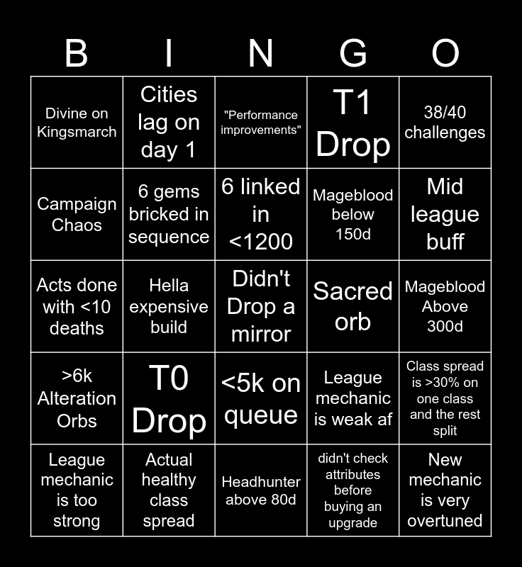 This bingo card has a free space and 35 words: Campaign Divine, Underpriced something and got spammed, Shitty starter, 6 gems bricked in sequence, <5k on queue, T1 Drop, Campaign Chaos, Scammed someone, 6 linked in <1200, 6/6 positive/negative ventors (0-29 life is negative for this), Acts done with <10 deaths, 38/40 challenges, Some currency gets priority over chaos, forgot at least 2 passives, Divine on Kingsmarch, Sacred orb, didn't check attributes before buying an upgrade, Hella expensive build, >6k Alteration Orbs, New mechanic is very overtuned, League mechanic is weak af, League mechanic is too strong, Class spread is >30% on one class and the rest split, Actual healthy class spread, "Performance improvements", Mid league buff, Mid league nerf, Common >20c unique blows up in price, Mageblood below 150d, Mageblood Above 300d, Headhunter below 30d, Headhunter above 80d, T0 Drop, Cities lag on day 1 and Early 6 link but wrong class.