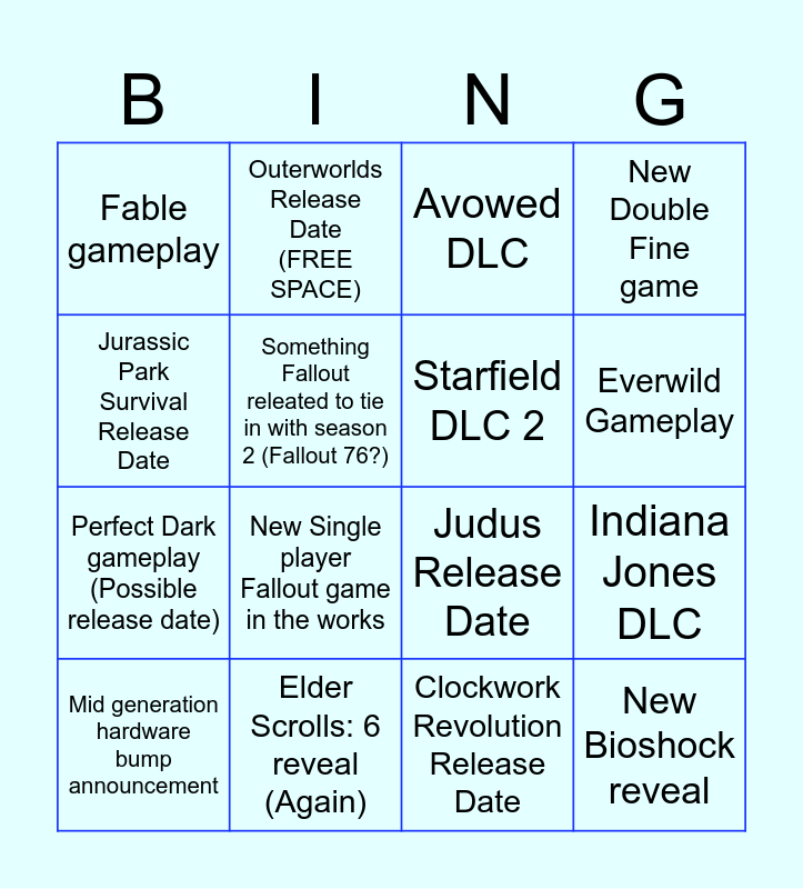 This bingo card has 16 words: Elder Scrolls: 6 reveal (Again), Indiana Jones DLC, Avowed DLC, Fable gameplay, Perfect Dark gameplay (Possible release date), Outerworlds Release Date (FREE SPACE), Judus Release Date, Clockwork Revolution Release Date, Jurassic Park Survival Release Date, Something Fallout releated to tie in with season 2 (Fallout 76?), Mid generation hardware bump announcement, New Double Fine game, New Single player Fallout game in the works, Everwild Gameplay, Starfield DLC 2 and New Bioshock reveal.