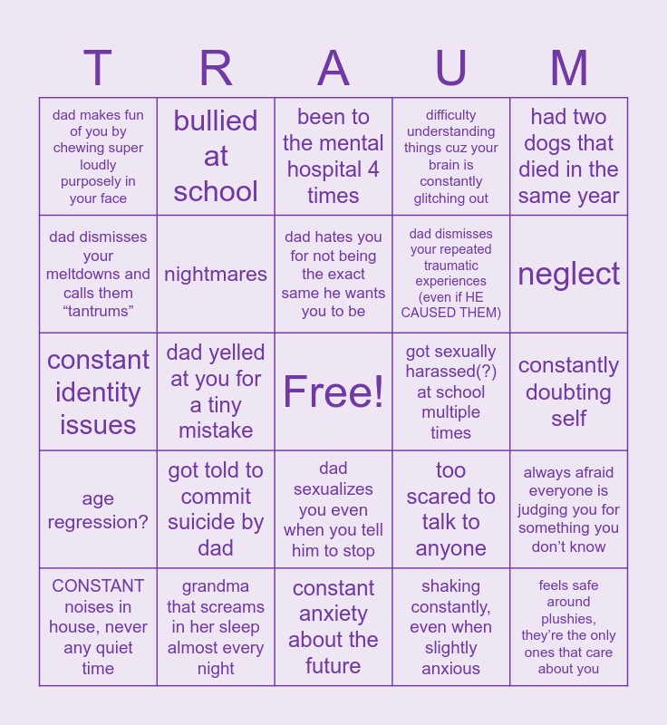 This bingo card has a free space and 24 words: got told to commit suicide by dad, grandma that screams in her sleep almost every night, dad hates you for not being the exact same he wants you to be, CONSTANT noises in house, never any quiet time, had two dogs that died in the same year, dad makes fun of you by chewing super loudly purposely in your face, dad dismisses your meltdowns and calls them “tantrums”, bullied at school, got sexually harassed(?) at school multiple times, dad sexualizes you even when you tell him to stop, dad dismisses your repeated traumatic experiences (even if HE CAUSED THEM), constant identity issues, too scared to talk to anyone, always afraid everyone is judging you for something you don’t know, nightmares, shaking constantly, even when slightly anxious, constantly doubting self, been to the mental hospital 4 times, neglect, dad yelled at you for a tiny mistake, feels safe around plushies, they’re the only ones that care about you, age regression?, difficulty understanding things cuz your brain is constantly glitching out and constant anxiety about the future.