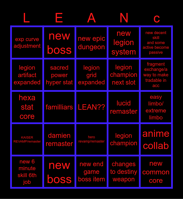 This bingo card has a free space and 29 words: new 6 minute skill 6th job, overseas classes, familliars, resistance revamp/remaster, exp curve adjustment, new epic dungeon, sacred power hyper stat, damien remaster, lucid remaster, new boss, easy limbo/ extreme limbo, new common core, new end game boss item, changes to destiny weapon, fragment exchange/a way to make tradable in acc, new link system, hero revamp/remaster, KAISER REVAMP/remaster, new decent skill and some active become passive, hexa stat core, legion champion, special node rework, legion champion next slot, legion artifact expanded, new legion system, new boss, anime collab, legion grid expanded and star force adjustment.