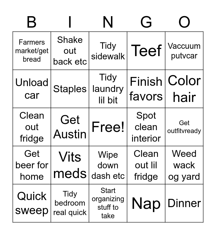 This bingo card has a free space and 24 words: Vits meds, Tidy bedroom real quick, Tidy laundry lil bit, Quick sweep, Vaccuum putvcar, Farmers market/get bread, Unload car, Shake out back etc, Spot clean interior, Wipe down dash etc, Finish favors, Clean out fridge, Clean out lil fridge, Weed wack og yard, Staples, Nap, Get outfitvready, Tidy sidewalk, Color hair, Get Austin, Dinner, Get beer for home, Teef and Start organizing stuff to take.