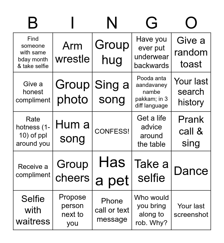 This bingo card has a free space and 24 words: Group cheers, Propose person next to you, Sing a song, Selfie with waitress, Give a random toast, Find someone with same bday month & take selfie, Give a honest compliment, Arm wrestle, Get a life advice around the table, Has a pet, Pooda anta aandavaney nambe pakkam; in 3 diff language, Rate hotness (1-10) of ppl around you, Take a selfie, Dance, Group photo, Who would you bring along to rob. Why?, Prank call & sing, Group hug, Your last search history, Hum a song, Your last screenshot, Receive a compliment, Have you ever put underwear backwards and Phone call or text message.