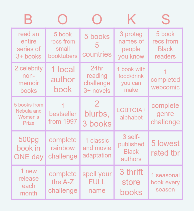 This bingo card has 25 words: 500pg book in ONE day, complete the A-Z challenge, 2 blurbs, 3 books, 3 thrift store books, 5 book recs from Black readers, read an entire series of 3+ books, 5 book recs from small booktubers, 5 books 5 countries, LGBTQIA+ alphabet, 5 lowest rated tbr, 2 celebrity non-memoir books, 1 local author book, spell your FULL name, 3 self-published Black authors, 1 completed webcomic, 1 new release each month, 1 bestseller from 1997, 24hr reading challenge 3+ novels, 1 book with food/drink you can make, complete genre challenge, 5 books from Nebula and Women's Prize, complete rainbow challenge, 1 classic and movie adaptation, 3 protag names of people you know and 1 seasonal book every season.