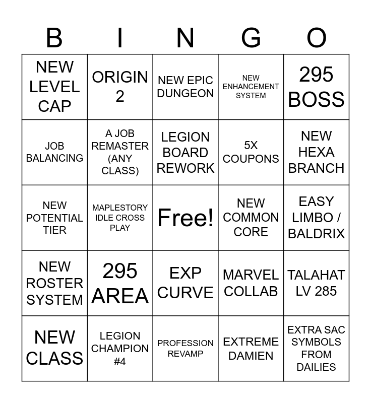 This bingo card has a free space and 24 words: 295 AREA, LEGION CHAMPION #4, LEGION BOARD REWORK, NEW CLASS, 295 BOSS, NEW LEVEL CAP, JOB BALANCING, ORIGIN 2, NEW COMMON CORE, EXP CURVE, 5X COUPONS, NEW POTENTIAL TIER, MARVEL COLLAB, TALAHAT LV 285, A JOB REMASTER (ANY CLASS), EXTREME DAMIEN, EASY LIMBO / BALDRIX, NEW EPIC DUNGEON, NEW HEXA BRANCH, MAPLESTORY IDLE CROSS PLAY, EXTRA SAC SYMBOLS FROM DAILIES, NEW ROSTER SYSTEM, NEW ENHANCEMENT SYSTEM and PROFESSION REVAMP.