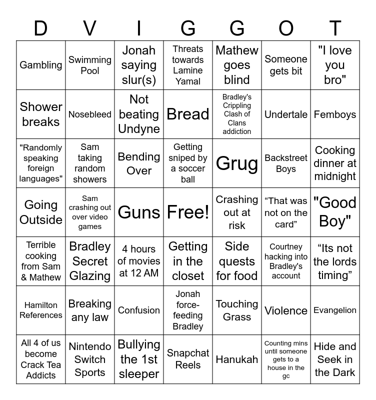 This bingo card has a free space and 59 words: Free Space, Going Outside, "Its for the card", Sam taking random showers, Guns, Violence, "I love you bro", Gay Romance, Nosebleed, Evangelion, Threats towards Lamine Yamal, Confusion, Someone gets bit, 4 hours of movies at 12 AM, Hanukah, Gambling, Undertale, Mathew goes blind, dviggi, Shower breaks, Femboys, Jonah saying slur(s), Cooking dinner at midnight, Backstreet Boys, Racist Stuff, Getting in the closet, Terrible cooking from Sam & Mathew, Hitler Fanfiction, Not beating Undyne, Courtney hacking into Bradley's account, Upsetting the neighbors, Breaking any law, Snapchat Reels, Counting mins until someone gets to a house in the gc, Swimming Pool, Crashing out at risk, Jonah force-feeding Bradley, Bradley's Crippling Clash of Clans addiction, Side quests for food, Bread, Touching Grass, Bending Over, "Randomly speaking foreign languages", Excessive Gambling, "Good Boy", All 4 of us become Crack Tea Addicts, Nintendo Switch Sports, Bullying the 1st sleeper, Getting sniped by a soccer ball, Sam crashing out over video games, “Okay Maybe”, Hamilton References, “That was not on the card”, Bradley Secret Glazing, “Its not the lords timing”, Grug, All Nighter, Hide and Seek in the Dark and Summoning Demons.