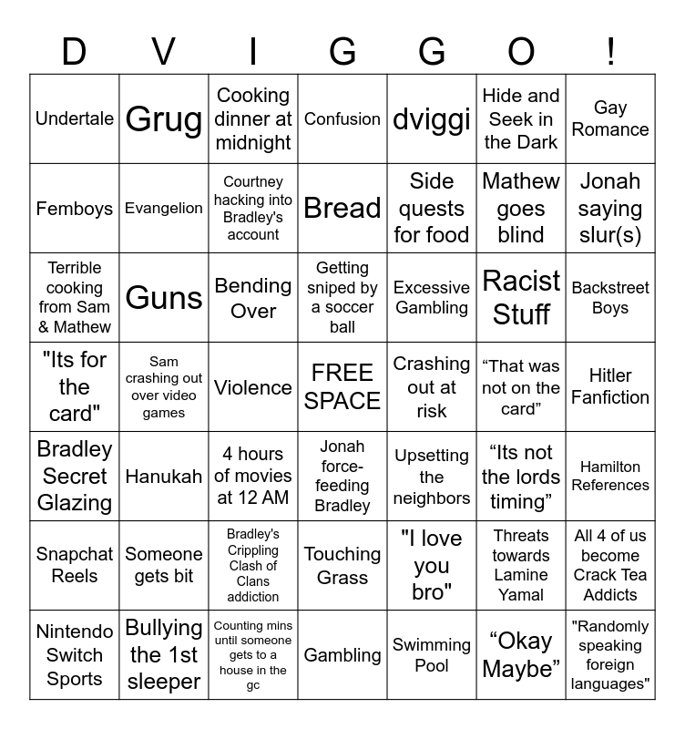 This bingo card has a free space and 58 words: Going Outside, "Its for the card", Sam taking random showers, Guns, Violence, "I love you bro", Gay Romance, Nosebleed, Evangelion, Threats towards Lamine Yamal, Confusion, Someone gets bit, 4 hours of movies at 12 AM, Hanukah, Gambling, Undertale, Mathew goes blind, dviggi, Shower breaks, Femboys, Jonah saying slur(s), Cooking dinner at midnight, Backstreet Boys, Racist Stuff, Getting in the closet, Terrible cooking from Sam & Mathew, Hitler Fanfiction, Not beating Undyne, Courtney hacking into Bradley's account, Upsetting the neighbors, Breaking any law, Snapchat Reels, Counting mins until someone gets to a house in the gc, Swimming Pool, Crashing out at risk, Jonah force-feeding Bradley, Bradley's Crippling Clash of Clans addiction, Side quests for food, Bread, Touching Grass, Bending Over, "Randomly speaking foreign languages", Excessive Gambling, "Good Boy", All 4 of us become Crack Tea Addicts, Nintendo Switch Sports, Bullying the 1st sleeper, Getting sniped by a soccer ball, Sam crashing out over video games, “Okay Maybe”, Hamilton References, “That was not on the card”, Bradley Secret Glazing, “Its not the lords timing”, Grug, All Nighter, Hide and Seek in the Dark and Summoning Demons.