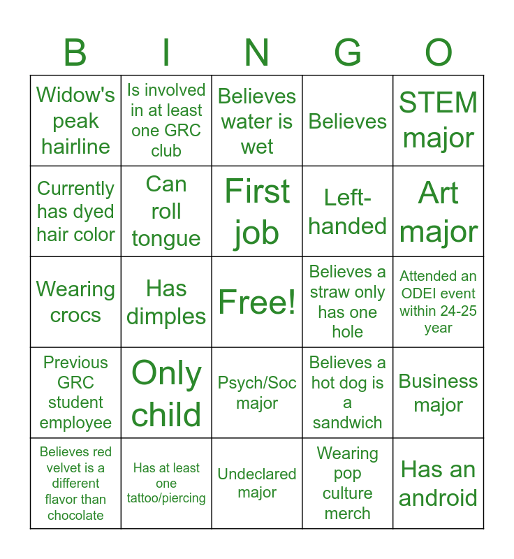 This bingo card has a free space and 24 words: Only child, Has at least one tattoo/piercing, First job, Believes red velvet is a different flavor than chocolate, STEM major, Widow's peak hairline, Currently has dyed hair color, Is involved in at least one GRC club, Believes a straw only has one hole, Psych/Soc major, Left-handed, Wearing crocs, Believes a hot dog is a sandwich, Business major, Can roll tongue, Wearing pop culture merch, Attended an ODEI event within 24-25 year, Believes water is wet, Art major, Has dimples, Has an android, Previous GRC student employee, Believes and Undeclared major.