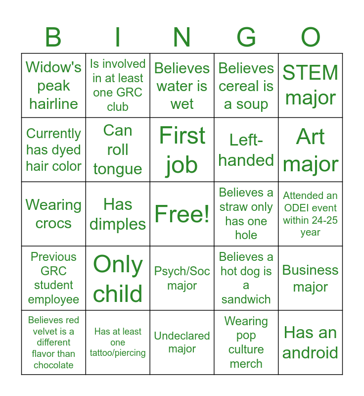 This bingo card has a free space and 24 words: Only child, Has at least one tattoo/piercing, First job, Believes red velvet is a different flavor than chocolate, STEM major, Widow's peak hairline, Currently has dyed hair color, Is involved in at least one GRC club, Believes a straw only has one hole, Psych/Soc major, Left-handed, Wearing crocs, Believes a hot dog is a sandwich, Business major, Can roll tongue, Wearing pop culture merch, Attended an ODEI event within 24-25 year, Believes water is wet, Art major, Has dimples, Has an android, Previous GRC student employee, Believes cereal is a soup and Undeclared major.