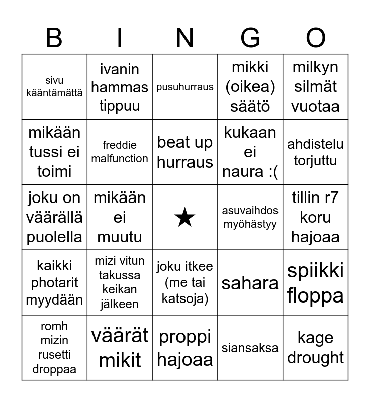 This bingo card has a free space and 24 words: mizi vitun takussa keikan jälkeen, väärät mikit, beat up hurraus, romh mizin rusetti droppaa, milkyn silmät vuotaa, sivu kääntämättä, mikään tussi ei toimi, ivanin hammas tippuu, asuvaihdos myöhästyy, joku itkee (me tai katsoja), kukaan ei naura :(, joku on väärällä puolella, sahara, spiikki floppa, freddie malfunction, siansaksa, tillin r7 koru hajoaa, pusuhurraus, ahdistelu torjuttu, mikään ei muutu, kage drought, kaikki photarit myydään, mikki (oikea) säätö and proppi hajoaa.