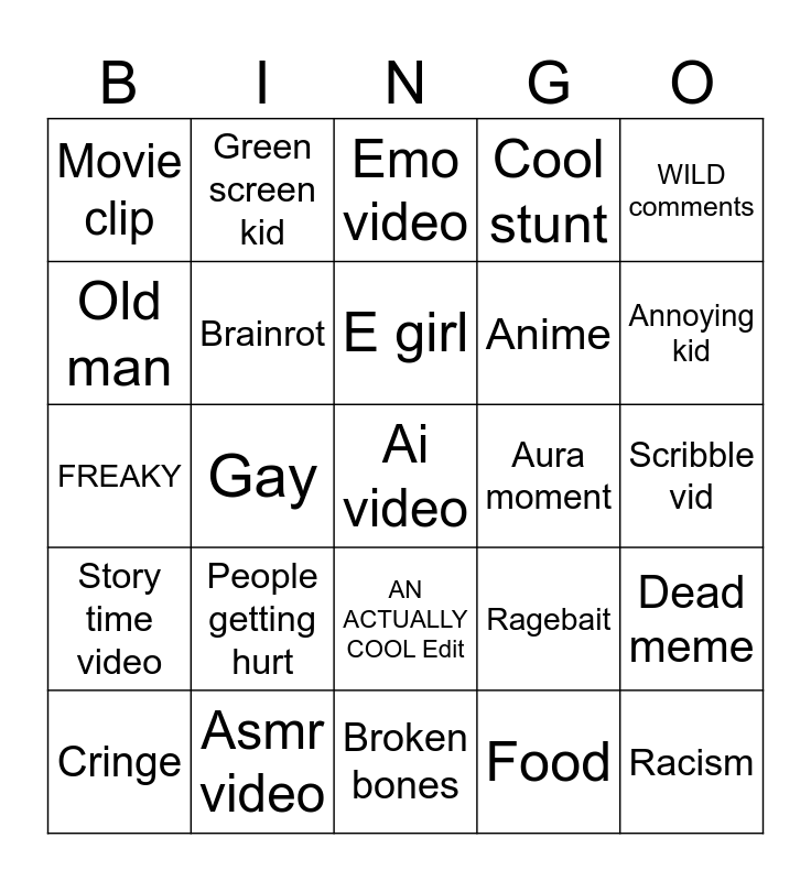 This bingo card has 25 words: People getting hurt, Broken bones, E girl, Cringe, WILD comments, Movie clip, Old man, Green screen kid, Aura moment, AN ACTUALLY COOL Edit, Anime, FREAKY, Ragebait, Dead meme, Brainrot, Racism, Scribble vid, Emo video, Annoying kid, Gay, Ai video, Asmr video, Story time video, Cool stunt and Food.