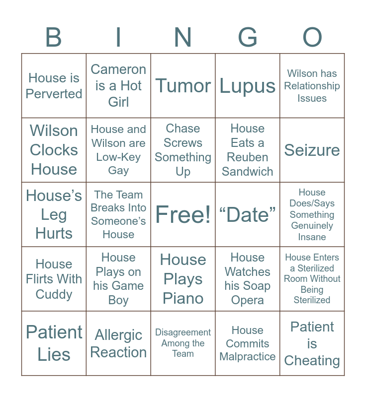 This bingo card has a free space and 34 words: House Does Drugs, House Commits Malpractice, Discrimination, Cameron is Ethical, House Flirts With Cuddy, House and Wilson are Low-Key Gay, Wilson has Relationship Issues, Patient Lies, Cameron is a Hot Girl, Foreman is Black, Chase Screws Something Up, Tumor, STD, Cuddy Won’t Allow House to do Something, “Date”, Seizure, Allergic Reaction, House’s Leg Hurts, House Plays on his Game Boy, House Watches his Soap Opera, House Plays Piano, House Hooker Joke, House is Perverted, House Does/Says Something Genuinely Insane, Disagreement Among the Team, Patient is Cheating, Lupus, Betting, House Eats a Reuben Sandwich, Wilson Clocks House, House Does Something to a Patient Without Their Consent, The Team Breaks Into Someone’s House, House Enters a Sterilized Room Without Being Sterilized and House Thinks Someone is Lying.