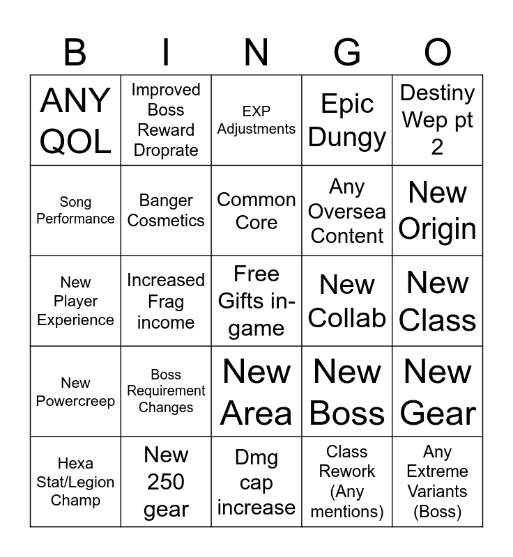 This bingo card has a free space and 24 words: Boss Requirement Changes, New 250 gear, Common Core, Hexa Stat/Legion Champ, Destiny Wep pt 2, ANY QOL, Song Performance, Improved Boss Reward Droprate, New Collab, New Area, Any Oversea Content, New Player Experience, New Boss, New Gear, Banger Cosmetics, Class Rework (Any mentions), New Class, EXP Adjustments, New Origin, Increased Frag income, Any Extreme Variants (Boss), New Powercreep, Epic Dungy and Dmg cap increase.