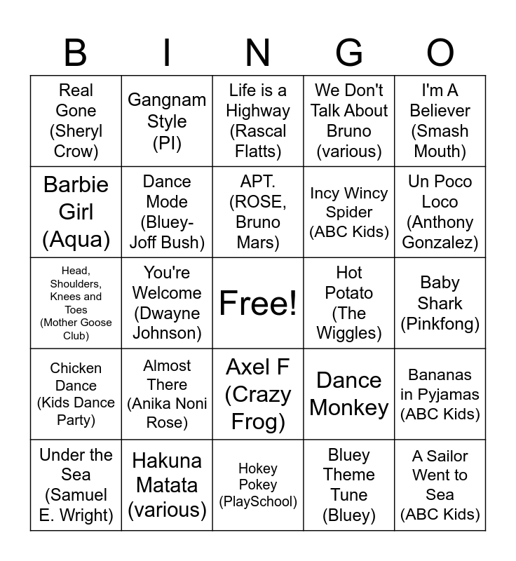 This bingo card has a free space and 34 words: I Like To Move It (will.i.am), Chicken Banana, The Duck Song (The Duck), The Gummy Bear Song (Gummibar), Baby Shark (Pinkfong), Barbie Girl (Aqua), Dance Mode (Bluey-Joff Bush), Hokey Pokey (PlaySchool), Incy Wincy Spider (ABC Kids), A Sailor Went to Sea (ABC Kids), Head, Shoulders, Knees and Toes (Mother Goose Club), Gangnam Style (PI), Bluey Theme Tune (Bluey), Let It Go (Frozen), Chicken Dance (Kids Dance Party), You're Welcome (Dwayne Johnson), Axel F (Crazy Frog), Hot Potato (The Wiggles), Bananas in Pyjamas (ABC Kids), Under the Sea (Samuel E. Wright), Hakuna Matata (various), You've Got a Friend in Me (Randy Newman), We Don't Talk About Bruno (various), Un Poco Loco (Anthony Gonzalez), Friend Like Me (Robin Williams), Almost There (Anika Noni Rose), Life is a Highway (Rascal Flatts), Can't Stop the Feeling (Justin Timberlake), I'm A Believer (Smash Mouth), Real Gone (Sheryl Crow), Everything is Awesome (various), APT. (ROSE, Bruno Mars), Dance Monkey and Try Everything (Shakira).