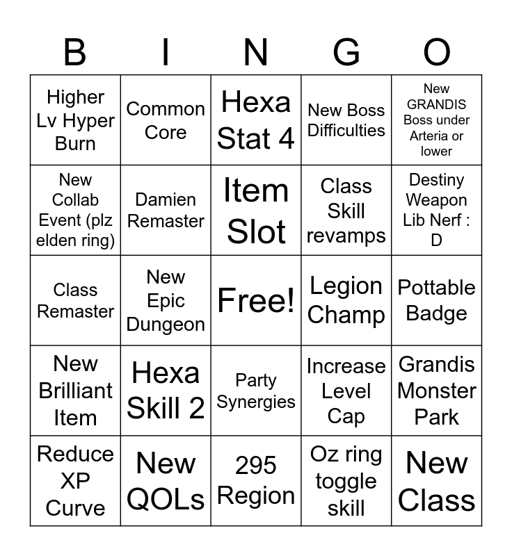 This bingo card has a free space and 24 words: Hexa Skill 2, New QOLs, Item Slot, Reduce XP Curve, New GRANDIS Boss under Arteria or lower, Higher Lv Hyper Burn, New Collab Event (plz elden ring), Common Core, Legion Champ, Party Synergies, Class Skill revamps, Class Remaster, Increase Level Cap, Grandis Monster Park, Damien Remaster, Oz ring toggle skill, Pottable Badge, Hexa Stat 4, Destiny Weapon Lib Nerf : D, New Epic Dungeon, New Class, New Brilliant Item, New Boss Difficulties and 295 Region.