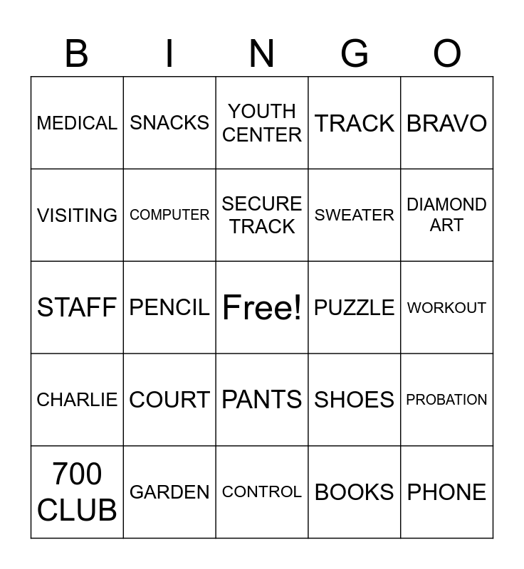 This bingo card has a free space and 44 words: SOCKS, PHONE, KITCHEN, 700 CLUB, COLLEGE, BOOKS, YOUTH CENTER, LETTERS, BRAVO, GARDEN, TRACK, PUZZLE, PANTS, COURT, WATER PACKET, CONTROL, A GROUP, STAFF, BOOKING, DIAMOND ART, SNACKS, TELEVISION, PICTURE, MEDICAL, POPCORN, WORKOUT, SHOWER, REMOTE, SHOES, CHARLIE, MOVIE NIGHT, PROBATION, C GROUP, SANDALS, PENCIL, B GROUP, GYM, CHURCH, SECURE TRACK, VISITING, SWEATER, DORM, COMPUTER and HOMEWORK.