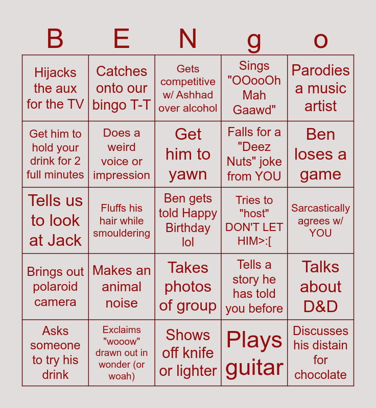 This bingo card has a free space and 30 words: Exclaims "wooow" drawn out in wonder (or woah), Asks for vape, Fluffs his hair while smouldering, Tells a gross work story, Hijacks the aux for the TV, Gets competitive w/ Ashhad over alcohol, Does a weird voice or impression, Takes photos of group, Tries to "host" DON'T LET HIM>:[, Shows off knife or lighter, Sarcastically agrees w/ YOU, Discusses his distain for chocolate, Plays guitar, Brings up politics, Ben loses a game, Curls his toes in a fist while lounging, Tells a story he has told you before, Brings out polaroid camera, Makes an animal noise, Parodies a music artist, Tells us to look at Jack, Get a photo with him where you are showing your bingo (w/o getting caught), Catches onto our bingo T-T, Falls for a "Deez Nuts" joke from YOU, Get him to hold your drink for 2 full minutes, Sings "OOooOh Mah Gaawd", Talks about D&D, Asks someone to try his drink, Get him to yawn and Get him to smell something.