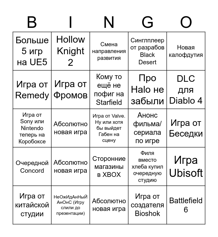 This bingo card has a free space and 24 words: Абсолютно новая игра, НеОжИдАнНыЙ АнОнС (Игру слили до презентации), Кому то ещё не пофиг на Starfield, Игра от китайской студии, Новая калофдутия, Больше 5 игр на UE5, Игра от Remedy, Hollow Knight 2, Анонс фильма/сериала по игре, Сторонние магазины в XBOX, Про Halo не забыли, Игра от Sony или Nintendo теперь на Коробоксе, Филя вместо хлеба купил очередную студию, Игра Ubisoft, Игра от Фромов, Игра от создателя Bioshok, Игра от Беседки, Смена направления развития, DLC для Diablo 4, Абсолютно новая игра, Battlefield 6, Очередной Concord, Синглплеер от разрабов Black Desert and Абсолютно новая игра.
