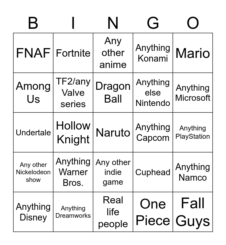 This bingo card has a free space and 24 words: Anything Warner Bros., Anything Dreamworks, Dragon Ball, Anything Disney, Mario, FNAF, Among Us, Fortnite, Anything Capcom, Any other indie game, Anything else Nintendo, Undertale, Cuphead, Anything Namco, TF2/any Valve series, One Piece, Anything PlayStation, Any other anime, Anything Microsoft, Hollow Knight, Fall Guys, Any other Nickelodeon show, Anything Konami and Real life people.
