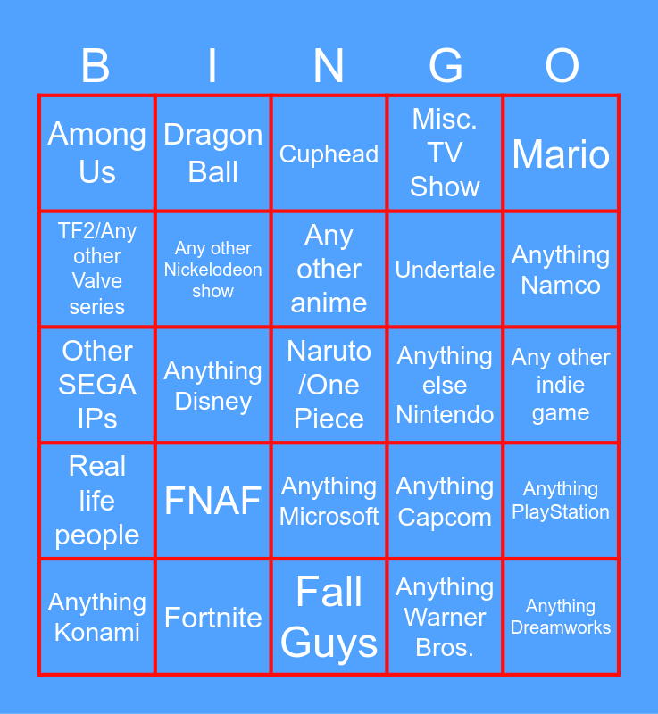 This bingo card has a free space and 24 words: FNAF, Fortnite, Any other anime, Anything Konami, Mario, Among Us, TF2/Any other Valve series, Dragon Ball, Anything else Nintendo, Anything Microsoft, Undertale, Other SEGA IPs, Anything Capcom, Anything PlayStation, Any other Nickelodeon show, Anything Warner Bros., Any other indie game, Cuphead, Anything Namco, Anything Disney, Anything Dreamworks, Real life people, Misc. TV Show and Fall Guys.