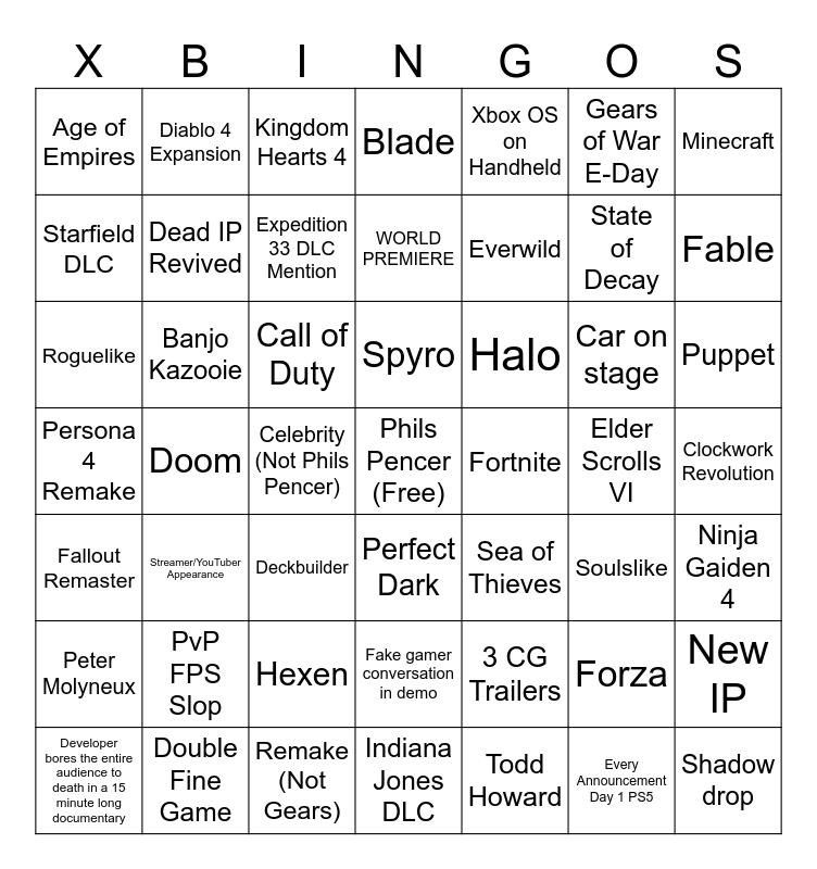 This bingo card has a free space and 48 words: 3 CG Trailers, State of Decay, Indiana Jones DLC, Doom, Call of Duty, Clockwork Revolution, Diablo 4 Expansion, Double Fine Game, Gears of War E-Day, Perfect Dark, Minecraft, Blade, Car on stage, Halo, Peter Molyneux, Elder Scrolls VI, Starfield DLC, Fable, Forza, Xbox OS on Handheld, Everwild, Celebrity (Not Phils Pencer), Age of Empires, Dead IP Revived, New IP, Expedition 33 DLC Mention, Puppet, Developer bores the entire audience to death in a 15 minute long documentary, Spyro, Banjo Kazooie, Every Announcement Day 1 PS5, Fortnite, Ninja Gaiden 4, PvP FPS Slop, Persona 4 Remake, Sea of Thieves, Soulslike, Roguelike, Deckbuilder, Hexen, Fallout Remaster, Shadow drop, Kingdom Hearts 4, Remake (Not Gears), WORLD PREMIERE, Fake gamer conversation in demo, Streamer/YouTuber Appearance and Todd Howard.