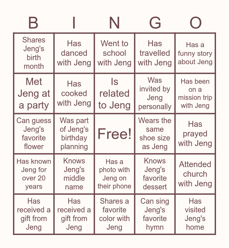 This bingo card has a free space and 24 words: Knows Jeng's middle name, Has received a gift from Jeng, Is related to Jeng, Has received a gift from Jeng, Has a funny story about Jeng, Shares Jeng's birth month, Met Jeng at a party, Has danced with Jeng, Wears the same shoe size as Jeng, Has a photo with Jeng on their phone, Was invited by Jeng personally, Can guess Jeng's favorite flower, Knows Jeng's favorite dessert, Attended church with Jeng, Has cooked with Jeng, Can sing Jeng's favorite hymn, Has prayed with Jeng, Went to school with Jeng, Has been on a mission trip with Jeng, Was part of Jeng's birthday planning, Has visited Jeng's home, Has known Jeng for over 20 years, Has travelled with Jeng and Shares a favorite color with Jeng.