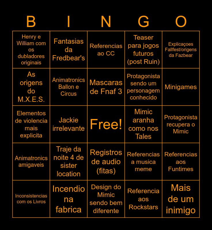 This bingo card has a free space and 24 words: Traje da noite 4 de sister location, Incendio na fabrica, Mascaras de Fnaf 3, Inconsistencias com os Livros, Explicaçoes Fallfest/origens da Fazbear, Henry e William com os dubladores originais, As origens do M.X.E.S., Fantasias da Fredbear's, Mimic aranha como nos Tales, Registros de audio (fitas), Protagonista sendo um personagem conhecido, Elementos de violencia mais explicita, Referencias a musica meme, Referencias aos Funtimes, Animatronics Ballon e Circus, Referencia aos Rockstars, Protagonista recupera o Mimic, Referencias ao CC, Minigames, Jackie irrelevante, Mais de um inimigo, Animatronics amigaveis, Teaser para jogos futuros (post Ruin) and Design do Mimic sendo bem diferente.