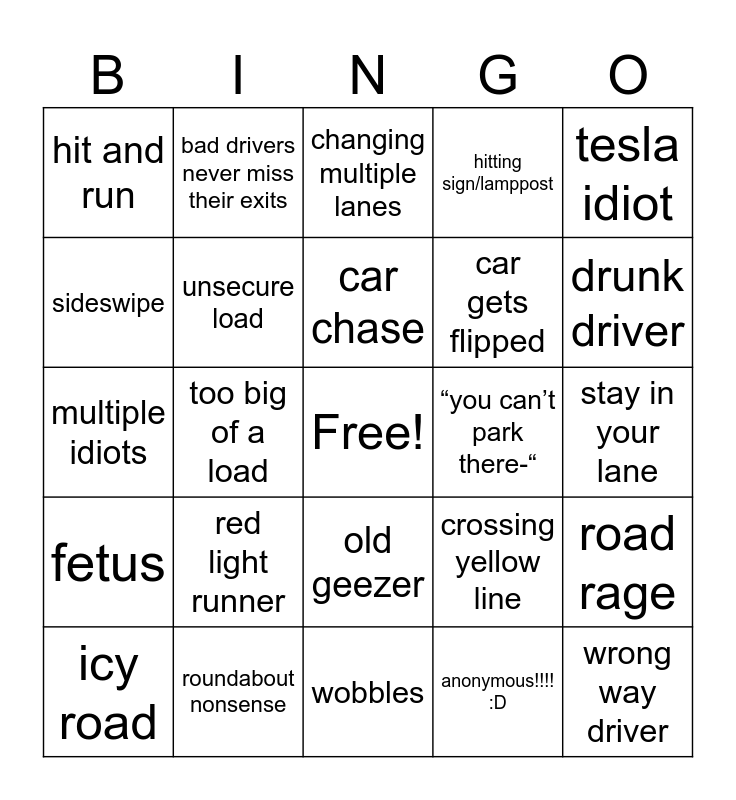 This bingo card has a free space and 46 words: t-bone, wrong way driver, snow, wobbles, red light runner, instant karma, bad drivers never miss their exits, “i turn now good luck everyone!!”, sideswipe, rear end, unsecure load, hitting sign/lamppost, road rage, crossing yellow line, front on collision, weaving in and out of traffic, car chase, “you can’t park there-“, truck idiot, tesla idiot, too big of a load, anonymous!!!! :D, hit and run, car gets flipped, speeding, drunk driver, icy road, hydroplaning, old geezer, fetus, merging gone wrong, “CHECK YOUR MIRRORS!!!”, shoulder driver, no turn signal, “stop signs are optional”, roundabout nonsense, stay in your lane, failure to yield, distracted driver, *takes gas pump with them*, turning from wrong lane, changing multiple lanes, multiple idiots, pileup, randomly coming to a full stop in the middle of the road and back up!.