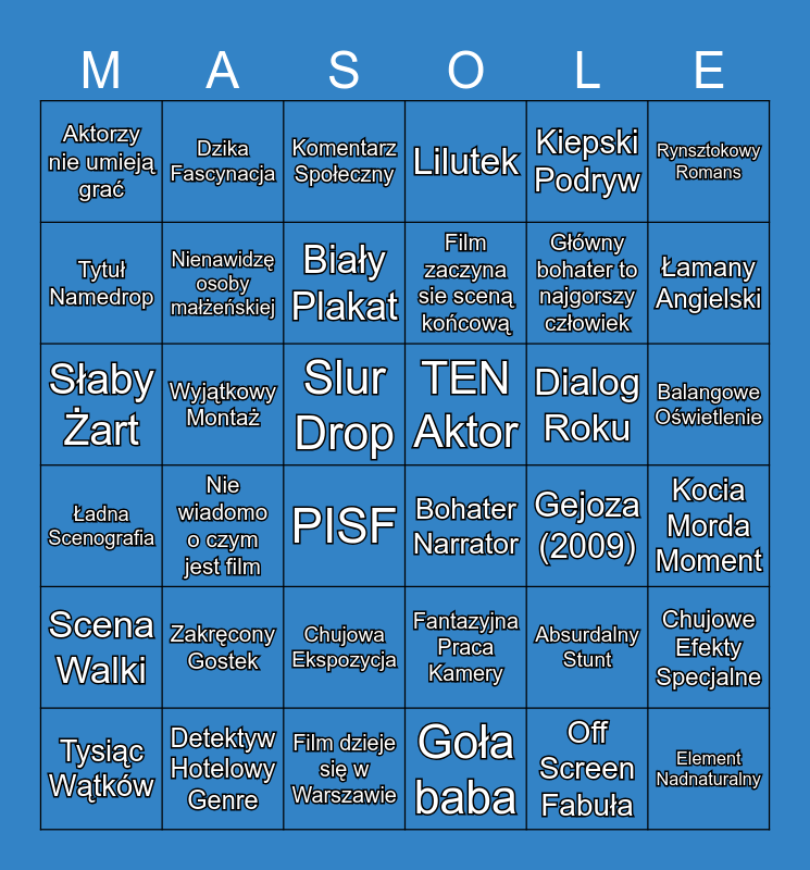 This bingo card has 36 words: Fantazyjna Praca Kamery, Chujowa Ekspozycja, Goła baba, Tytuł Namedrop, Ładna Scenografia, TEN Aktor, Nienawidzę osoby małżeńskiej, Film dzieje się w Warszawie, Kiepski Podryw, Absurdalny Stunt, Łamany Angielski, Lilutek, Chujowe Efekty Specjalne, Wyjątkowy Montaż, Film zaczyna sie sceną końcową, Aktorzy nie umieją grać, Scena Walki, Dialog Roku, Słaby Żart, Komentarz Społeczny, Slur Drop, Nie wiadomo o czym jest film, Bohater Narrator, PISF, Gejoza (2009), Dzika Fascynacja, Główny bohater to najgorszy człowiek, Detektyw Hotelowy Genre, Biały Plakat, Rynsztokowy Romans, Element Nadnaturalny, Tysiąc Wątków, Kocia Morda Moment, Balangowe Oświetlenie, Zakręcony Gostek and Off Screen Fabuła.