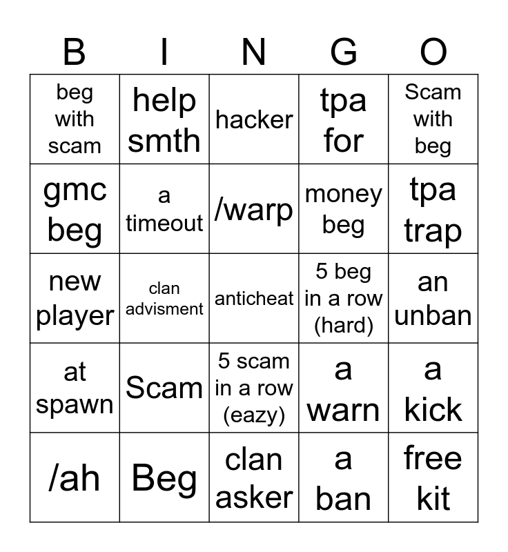 This bingo card has a free space and 24 words: Scam, Beg, /warp, /ah, Scam with beg, beg with scam, gmc beg, help smth, 5 beg in a row (hard), 5 scam in a row (eazy), money beg, new player, a warn, a kick, a timeout, a ban, an unban, hacker, tpa trap, clan advisment, free kit, at spawn, tpa for and clan asker.