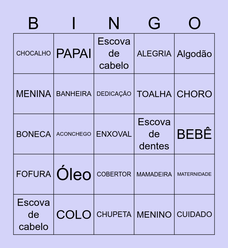 This bingo card has a free space and 33 words: LENCINHO, CHÁ DE FRALDAS, DEDICAÇÃO, ALMOFADA, BEBÊ, CHOCALHO, BANHEIRA, CHUPETA, TOALHA, CUIDADO, MENINA, PAPAI, MENINO, SONECA, BONECA, ACONCHEGO, COBERTOR, MAMADEIRA, MATERNIDADE, FOFURA, COLO, CRESCIMENTO, ALEGRIA, CHORO, Creme, Óleo, Escova de cabelo, Escova de dentes, Algodão, Escova de cabelo, Pente, Tesoura and Pinça.
