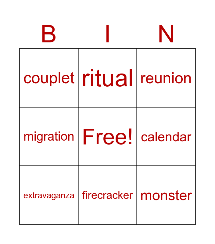 This bingo card has a free space and 9 words: extravaganza, reunion, ritual, migration, couplet, calendar, monster, firework and firecracker.