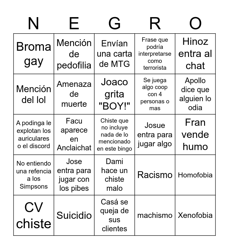 This bingo card has 25 words: Jose entra para jugar con los pibes, Casá se queja de sus clientes, Joaco grita "BOY!", CV chiste, Hinoz entra al chat, Broma gay, Mención del lol, Mención de pedofilia, Josue entra para jugar algo, Dami hace un chiste malo, Se juega algo coop con 4 personas o mas, A podinga le explotan los auriculares o el discord, Racismo, Homofobia, Amenaza de muerte, Xenofobia, Fran vende humo, Envían una carta de MTG, Apollo dice que alguien lo odia, Facu aparece en Anclaichat, Chiste que no incluye nada de lo mencionado en este bingo, Suicidio, No entiendo una refencia a los Simpsons, Frase que podría interpretarse como terrorista and machismo.