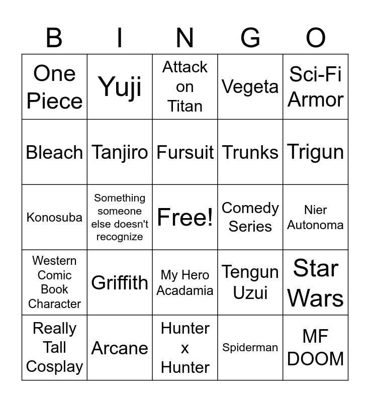 This bingo card has a free space and 59 words: Electronic components, Arcane, Akatsuki, Western Comic Book Character, Spiderman, JoJo's Bizarre Adventure, Tanjiro, Hashira, Trunks, Goku, Vegeta, Nezuko, Bleach, Luffy, Zoro, One Piece, MF DOOM, Sci-Fi Armor, Fantasy Armor, Fursuit, Comedy Series, Attack on Titan, Really Tall Cosplay, Star Wars, Levi Ackerman, Jotaro Kujo, Guts, Cyberpunk, Trigun, Sukuna, Gojo, Jujutsu Kaisen, Neon Genesis Evangelion, Gendo Ikari, Yuji, Persona, Tobi, Something someone else doesn't recognize, Beer Cases, Konosuba, Super Mario, Griffith, Nier Autonoma, Sung Jin-woo, Any meme, Devil May Cry, Monster Hunter, Fullmetal Alchemist, My Hero Acadamia, Hunter x Hunter, Cowboy Bebop, Genshin Impact, Naruto (Series), Adventure Time, Final Fantasy, Tengun Uzui, Chainsaw Man, Spike Spiegel and Haikyuu.