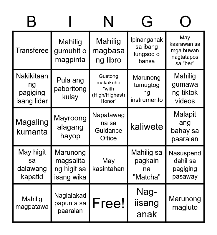 This bingo card has 25 words: May higit sa dalawang kapatid, Naglalakad papunta sa paaralan, Napatawag na sa Guidance Office, Nag-iisang anak, May kaarawan sa mga buwan nagtatapos sa "ber", Transferee, Mahilig gumuhit o magpinta, Mahilig magbasa ng libro, kaliwete, Nasuspend dahil sa pagiging pasaway, Nakikitaan ng pagiging isang lider, Pula ang paboritong kulay, Free!, Mahilig sa pagkain na "Matcha", Mahilig gumawa ng tiktok videos, Mahilig magpatawa, Mayroong alagang hayop, Gustong makakuha "with (High/Highest) Honor", Marunong tumugtog ng instrumento, Malapit ang bahay sa paaralan, Magaling kumanta, Marunong magsalita ng higit sa isang wika, May kasintahan, Ipinanganak sa ibang lungsod o bansa and Marunong magluto.