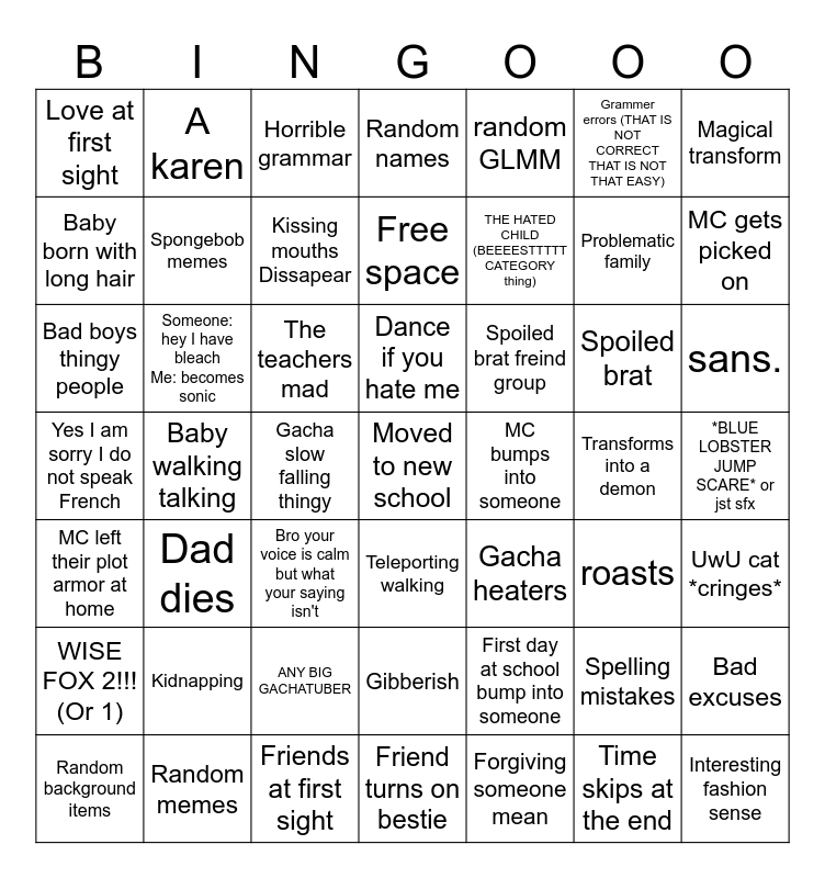 This bingo card has 49 words: Spelling mistakes, Problematic family, Forgiving someone mean, Baby walking talking, The teachers mad, *BLUE LOBSTER JUMP SCARE* or jst sfx, A karen, Friends at first sight, Grammer errors (THAT IS NOT CORRECT THAT IS NOT THAT EASY), Teleporting walking, Magical transform, Random names, Spoiled brat, Spoiled brat freind group, Kidnapping, Transforms into a demon, Baby born with long hair, MC gets picked on, Bad excuses, random GLMM, THE HATED CHILD (BEEEESTTTTT CATEGORY thing), Gacha slow falling thingy, Love at first sight, Spongebob memes, Random background items, Kissing mouths Dissapear, sans., Random memes, Dance if you hate me, Someone: hey I have bleach Me: becomes sonic, Interesting fashion sense, MC bumps into someone, WISE FOX 2!!! (Or 1), ANY BIG GACHATUBER, Yes I am sorry I do not speak French, Gacha heaters, roasts, UwU cat *cringes*, Bad boys thingy people, Bro your voice is calm but what your saying isn't, Gibberish, MC left their plot armor at home, Moved to new school, Friend turns on bestie, Free space, Horrible grammar, First day at school bump into someone, Dad dies and Time skips at the end.