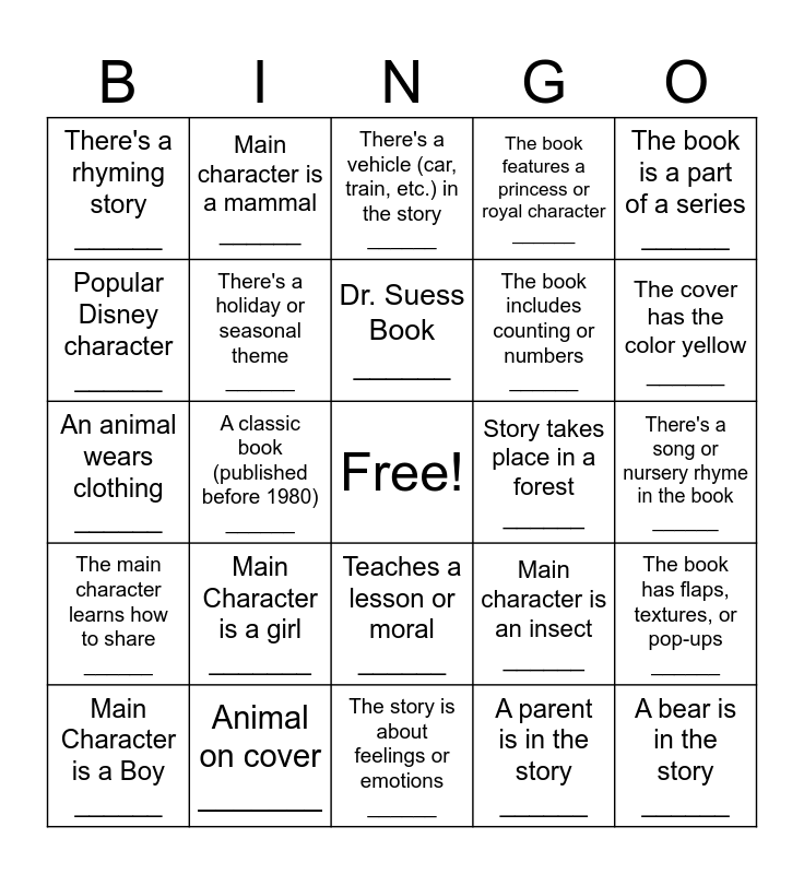 This bingo card has a free space and 24 words: Main Character is a girl _______, Animal on cover _______, Dr. Suess Book ______, Main Character is a Boy ______, The book is a part of a series ______, There's a rhyming story ______, Popular Disney character ______, Main character is a mammal ______, Story takes place in a forest ______, Teaches a lesson or moral ______, The book includes counting or numbers ______, An animal wears clothing ______, Main character is an insect ______, The book has flaps, textures, or pop-ups ______, There's a holiday or seasonal theme ______, A parent is in the story ______, There's a song or nursery rhyme in the book ______, There's a vehicle (car, train, etc.) in the story ______, The cover has the color yellow ______, A classic book (published before 1980) ______, A bear is in the story ______, The main character learns how to share ______, The book features a princess or royal character ______ and The story is about feelings or emotions ______.