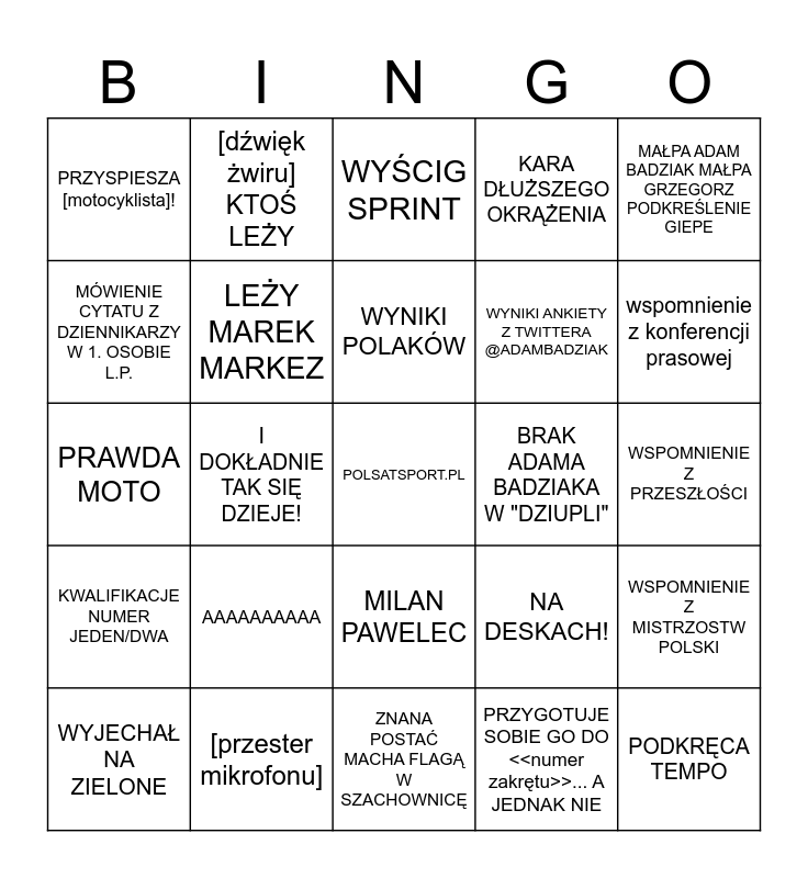 This bingo card has a free space and 24 words: AAAAAAAAAA, [przester mikrofonu], WYNIKI POLAKÓW, WYJECHAŁ NA ZIELONE, MAŁPA ADAM BADZIAK MAŁPA GRZEGORZ PODKREŚLENIE GIEPE, PRZYSPIESZA [motocyklista]!, MÓWIENIE CYTATU Z DZIENNIKARZY W 1. OSOBIE L.P., [dźwięk żwiru] KTOŚ LEŻY, BRAK ADAMA BADZIAKA W "DZIUPLI", MILAN PAWELEC, WYNIKI ANKIETY Z TWITTERA @ADAMBADZIAK, PRAWDA MOTO, NA DESKACH!, WSPOMNIENIE Z MISTRZOSTW POLSKI, LEŻY MAREK MARKEZ, PRZYGOTUJE SOBIE GO DO <<numer zakrętu>>... A JEDNAK NIE, WSPOMNIENIE Z PRZESZŁOŚCI, WYŚCIG SPRINT, wspomnienie z konferencji prasowej, I DOKŁADNIE TAK SIĘ DZIEJE!, PODKRĘCA TEMPO, KWALIFIKACJE NUMER JEDEN/DWA, KARA DŁUŻSZEGO OKRĄŻENIA and ZNANA POSTAĆ MACHA FLAGĄ W SZACHOWNICĘ.
