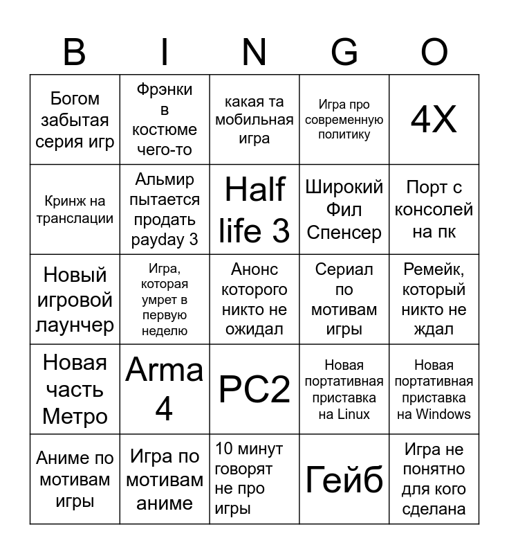 This bingo card has a free space and 24 words: Arma 4, Игра по мотивам аниме, Half life 3, Аниме по мотивам игры, 4X, Богом забытая серия игр, Кринж на транслации, Фрэнки в костюме чего-то, Сериал по мотивам игры, PC2, Широкий Фил Спенсер, Новый игровой лаунчер, Новая портативная приставка на Linux, Новая портативная приставка на Windows, Альмир пытается продать payday 3, Гейб, Ремейк, который никто не ждал, какая та мобильная игра, Порт с консолей на пк, Игра, которая умрет в первую неделю, Игра не понятно для кого сделана, Новая часть Метро, Игра про современную политику and 10 минут говорят не про игры.