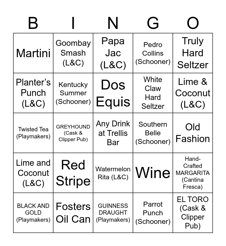 This bingo card has a free space and 24 words: Red Stripe, Fosters Oil Can, Dos Equis, BLACK AND GOLD (Playmakers), Truly Hard Seltzer, Martini, Planter’s Punch (L&C), Goombay Smash (L&C), Southern Belle (Schooner), Watermelon Rita (L&C), White Claw Hard Seltzer, Twisted Tea (Playmakers), Wine, Hand-Crafted MARGARITA (Cantina Fresca), Kentucky Summer (Schooner), Parrot Punch (Schooner), Old Fashion, Papa Jac (L&C), Lime & Coconut (L&C), GREYHOUND (Cask & Clipper Pub), EL TORO (Cask & Clipper Pub), Lime and Coconut (L&C), Pedro Collins (Schooner) and GUINNESS DRAUGHT (Playmakers).