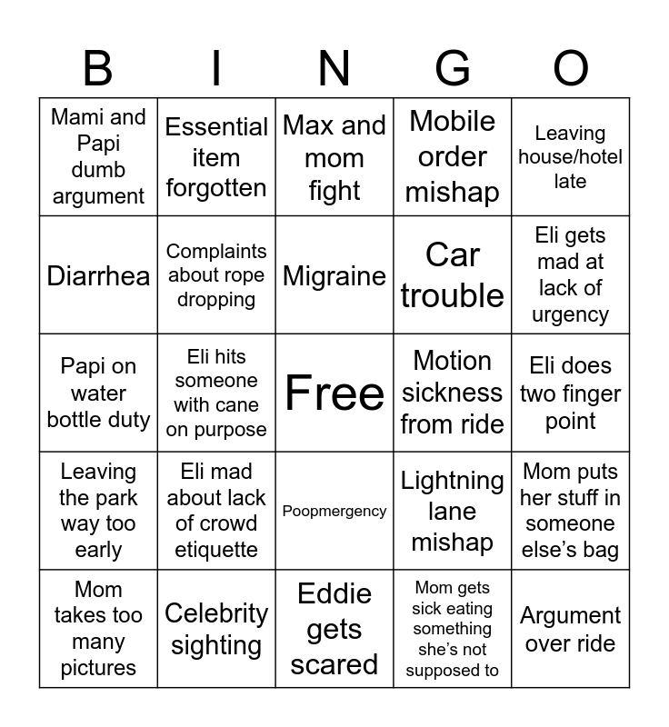 This bingo card has a free space and 24 words: Eli mad about lack of crowd etiquette, Celebrity sighting, Migraine, Mom takes too many pictures, Leaving house/hotel late, Mami and Papi dumb argument, Diarrhea, Essential item forgotten, Motion sickness from ride, Poopmergency, Car trouble, Papi on water bottle duty, Lightning lane mishap, Mom puts her stuff in someone else’s bag, Complaints about rope dropping, Mom gets sick eating something she’s not supposed to, Eli does two finger point, Max and mom fight, Eli gets mad at lack of urgency, Eli hits someone with cane on purpose, Argument over ride, Leaving the park way too early, Mobile order mishap and Eddie gets scared.