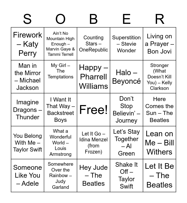 This bingo card has a free space and 49 words: Bohemian Rhapsody – Queen, Let It Be – The Beatles, Imagine – John Lennon, Hey Jude – The Beatles, What a Wonderful World – Louis Armstrong, Respect – Aretha Franklin, Ain’t No Mountain High Enough – Marvin Gaye & Tammi Terrell, Billie Jean – Michael Jackson, Man in the Mirror – Michael Jackson, I Will Always Love You – Whitney Houston, My Girl – The Temptations, Superstition – Stevie Wonder, Lean on Me – Bill Withers, Let’s Stay Together – Al Green, Stand by Me – Ben E. King, Uptown Funk – Mark Ronson ft. Bruno Mars, Happy – Pharrell Williams, Don’t Stop Believin’ – Journey, Eye of the Tiger – Survivor, Living on a Prayer – Bon Jovi, I Want It That Way – Backstreet Boys, Shake It Off – Taylor Swift, Firework – Katy Perry, Halo – Beyoncé, A Thousand Miles – Vanessa Carlton, Stronger (What Doesn’t Kill You) – Kelly Clarkson, Someone Like You – Adele, Rolling in the Deep – Adele, Let It Go – Idina Menzel (from Frozen), You Belong With Me – Taylor Swift, Fight Song – Rachel Platten, Beautiful – Christina Aguilera, Skyscraper – Demi Lovato, Count on Me – Bruno Mars, Somewhere Over the Rainbow – Judy Garland, I Wanna Dance With Somebody – Whitney Houston, You’ve Got a Friend – James Taylor, Can't Help Falling in Love – Elvis Presley, Here Comes the Sun – The Beatles, All of Me – John Legend, Just the Way You Are – Bruno Mars, How Far I’ll Go – Auli’i Cravalho (from Moana), Shallow – Lady Gaga & Bradley Cooper, This Is Me – Keala Settle, Imagine Dragons – Thunder, Counting Stars – OneRepublic, Fix You – Coldplay, Viva La Vida – Coldplay and Love Story – Taylor Swift.
