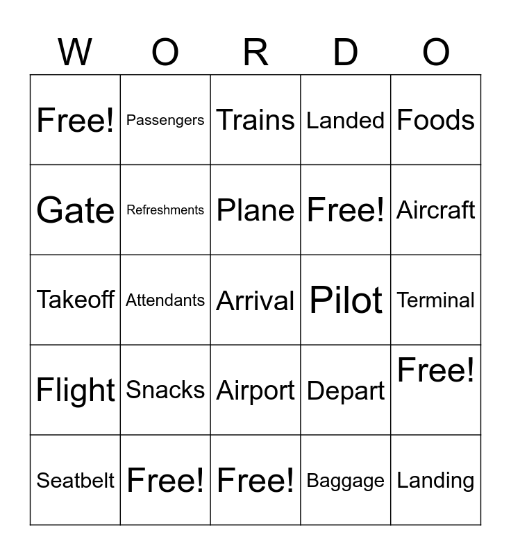 This bingo card has 25 words: Flight, Free!, Arrival, Baggage, Foods, Free!, Passengers, Trains, Pilot, Free!, Gate, Refreshments, Free!, Depart, Aircraft, Seatbelt, Attendants, Plane, Free!, Terminal, Takeoff, Snacks, Airport, Landed and Landing.