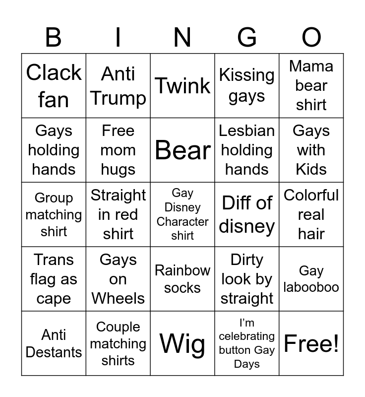 This bingo card has 33 words: Free!, Rainbow umbrella, Straight in red shirt, Lesbian couple with kids, Trans flag as cape, Free mom hugs, Mama bear shirt, Anti Destants, Anti Trump, Rainbow Mickey ears, Bear, Twink, Twink and Bear Couple, Are both bottoms?, Diff of disney, Gays with Kids, Couple matching shirts, Group matching shirt, Gays on Wheels, Dirty look by straight, Rainbow socks, Drag Queen, Clack fan, Colorful real hair, Wig, Gay Disney Character shirt, Kissing gays, Lesbian holding hands, Gays holding hands, Gay labooboo, Pronoun shirt, I’m celebrating button Gay Days and Someone flirts with our group.