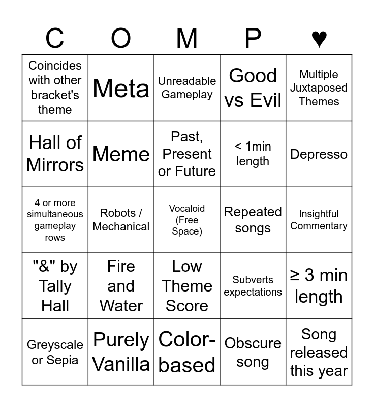 This bingo card has a free space and 24 words: Fire and Water, Purely Vanilla, Past, Present or Future, Greyscale or Sepia, Multiple Juxtaposed Themes, Coincides with other bracket's theme, Hall of Mirrors, Meta, Repeated songs, Low Theme Score, < 1min length, 4 or more simultaneous gameplay rows, Subverts expectations, ≥ 3 min length, Meme, Obscure song, Insightful Commentary, Unreadable Gameplay, Depresso, Robots / Mechanical, Song released this year, "&" by Tally Hall, Good vs Evil and Color-based.