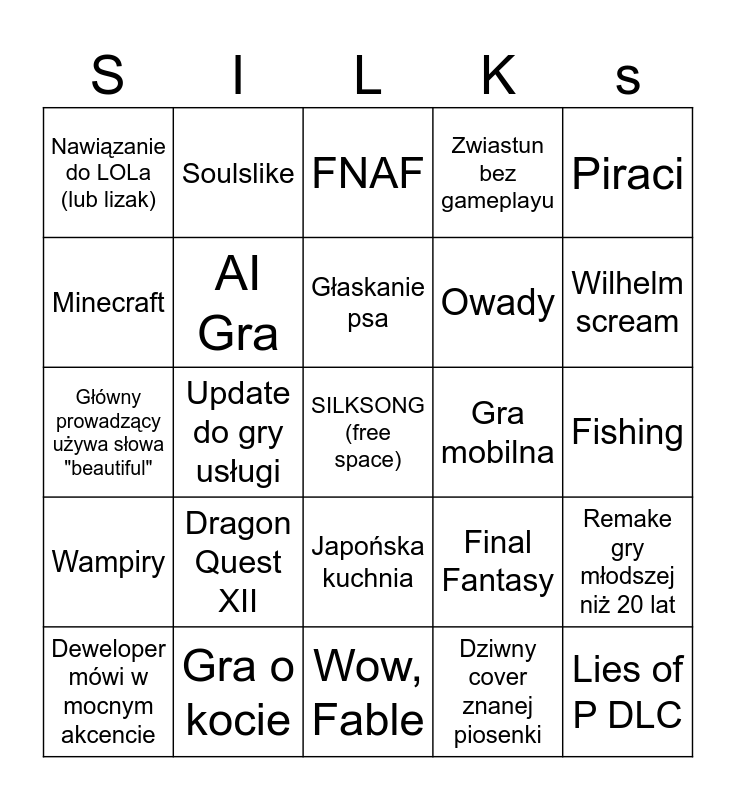 This bingo card has a free space and 49 words: Farming Sim, Lies of P DLC, Sonic, Wow, Fable, Dragon Quest XII, Zwiastun z 7 napisami na cały ekran, Soulslike, Super bohaterowie, Minecraft, Znany aktor w grze, AI Gra, Zwiastun bez gameplayu, Remake gry młodszej niż 20 lat, Final Fantasy, Slay The Spire II, TA GRA ZMIENI WSZYSTKO, Głaskanie psa, Gra mobilna, Krab, Piraci, Update do gry usługi, Dziwny cover znanej piosenki, Nawiązanie do LOLa (lub lizak), Owady, Kingdom Hearts IV, Wilhelm scream, Deweloper mówi w mocnym akcencie, Half Life 3, Japońska kuchnia, Wampiry, Kowboje, Ninja, Toaleta, Ktoś umiera z przyczyn naturalnych, Gra o kocie, Mewgenics, Neologizm wybrańca, Reklama skina, Fishing, Polacy, Ktoś się za kogoś poświęca, Fake laugh, Zwiastun głównie gameplay, Nowa gra w którą na pewno zagram, Główny prowadzący używa słowa "beautiful", FNAF, Reklama czegoś nijak niezwiązanego z grami, Gra wychodzi w tym tygodniu and Wioska się pali.