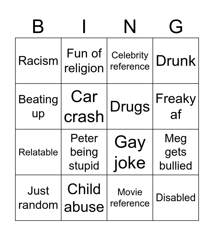 This bingo card has 16 words: Child abuse, Meg gets bullied, Celebrity reference, Racism, Relatable, Fun of religion, Gay joke, Movie reference, Beating up, Car crash, Just random, Drunk, Peter being stupid, Freaky af, Drugs and Disabled.