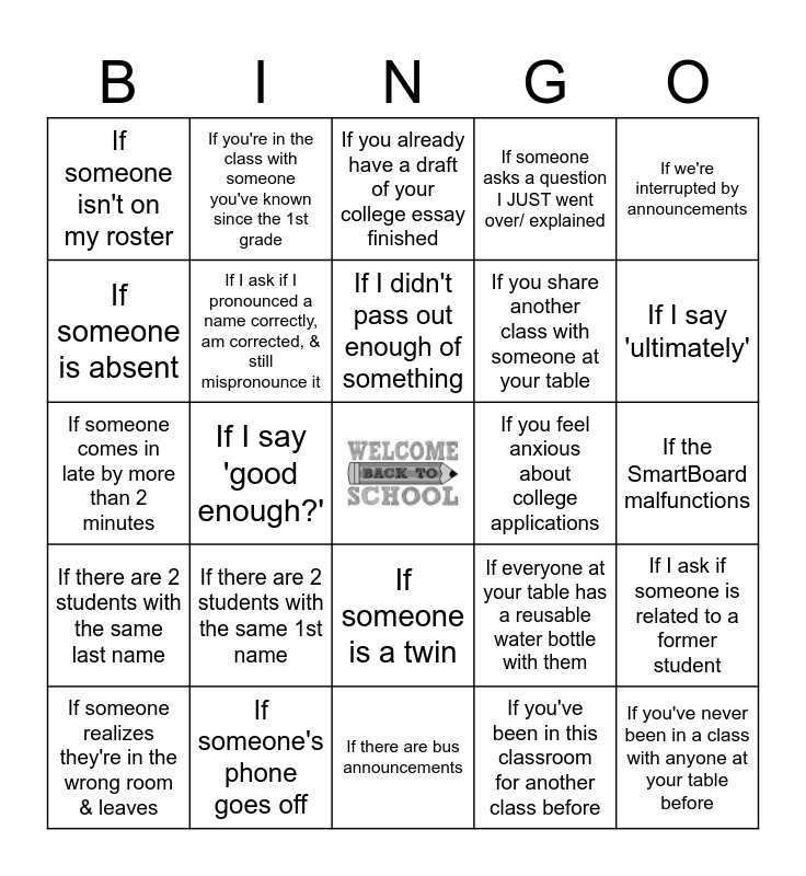 This bingo card has a free space and 24 words: If there are 2 students with the same 1st name, If someone's phone goes off, If I didn't pass out enough of something, If someone realizes they're in the wrong room & leaves, If we're interrupted by announcements, If someone isn't on my roster, If someone is absent, If you're in the class with someone you've known since the 1st grade, If you feel anxious about college applications, If someone is a twin, If you share another class with someone at your table, If someone comes in late by more than 2 minutes, If everyone at your table has a reusable water bottle with them, If I ask if someone is related to a former student, If I ask if I pronounced a name correctly, am corrected, & still mispronounce it, If you've been in this classroom for another class before, If the SmartBoard malfunctions, If you already have a draft of your college essay finished, If I say 'ultimately', If I say 'good enough?', If you've never been in a class with anyone at your table before, If there are 2 students with the same last name, If someone asks a question I JUST went over/ explained and If there are bus announcements.