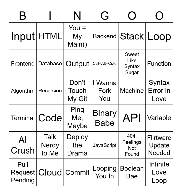 This bingo card has 50 words: Python, Algorithm, GitHub, API, Machine, Cloud, HTML, Debug, Loop, Commit, Frontend, Backend, Code, Terminal, Boolean, JavaScript, Database, Recursion, Object, Stack, Function, Variable, Input, Output, IDE, AI Crush, Ctrl+Alt+Cute, Commit to Me, You = My Main(), Syntax Error in Love, Console Me, Baby, 404: Feelings Not Found, My Code > Your Ex, Hotter than CPU, Binary Babe, Deploy the Drama, Looping You In, Boolean Bae, Infinite Love Loop, Don’t Touch My Git, Pull Request Pending, Caught in Your Exception, Flirtware Update Needed, Main() Squeeze, Ping Me, Maybe, Sweet Like Syntax Sugar, Talk Nerdy to Me, Git Push My Buttons, I Wanna Fork You and Baby You Had Me @HelloWorld.