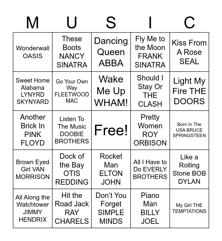 This bingo card has a free space and 24 words: Dock of the Bay OTIS REDDING, Hit the Road Jack RAY CHARELS, Wake Me Up WHAM!, All Along the Watchtower JIMMY HENDRIX, Kiss From A Rose SEAL, Wonderwall OASIS, Sweet Home Alabama LYNYRD SKYNYARD, These Boots NANCY SINATRA, Pretty Women ROY ORBISON, Rocket Man ELTON JOHN, Should I Stay Or THE CLASH, Another Brick In PINK FLOYD, All I Have to Do EVERLY BROTHERS, Like a Rolling Stone BOB DYLAN, Go Your Own Way FLEETWOOD MAC, Piano Man BILLY JOEL, Born In The USA BRUCE SPRINGSTEEN, Dancing Queen ABBA, Light My Fire THE DOORS, Listen To The Music DOOBIE BROTHERS, My Girl THE TEMPTATIONS, Brown Eyed Girl VAN MORRISON, Fly Me to the Moon FRANK SINATRA and Don’t You Forget SIMPLE MINDS.